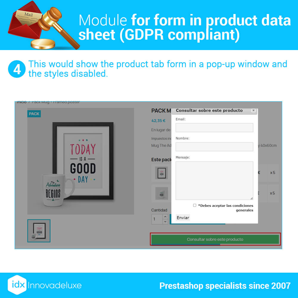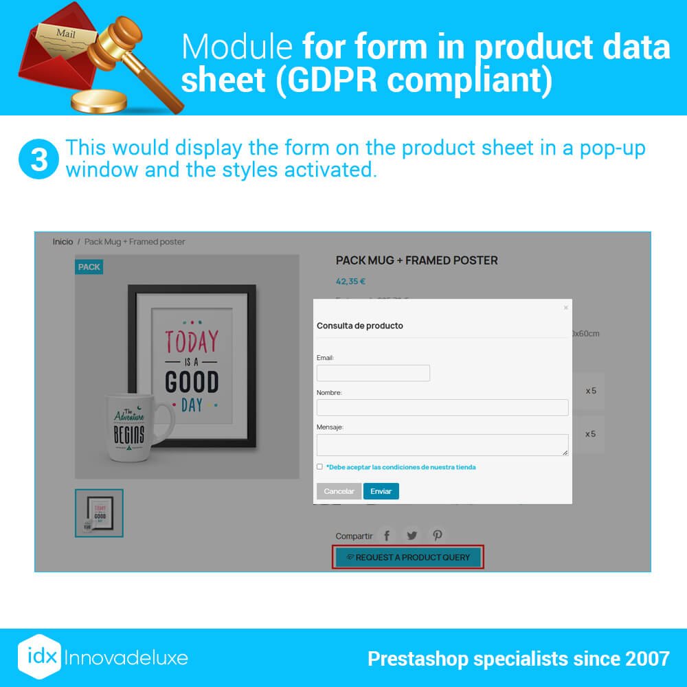 If you add a form on your product pages, it must comply with the European legal regulations for the protection of personal data (GDPR-RGPD).